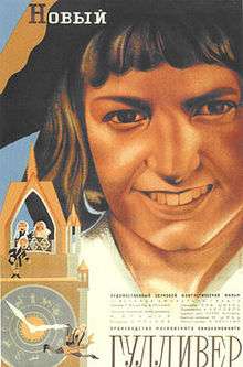 The New Gulliver (Russian: Новый Гулливер, Novyy Gullivyer) is a Soviet stop motion-animated cartoon, and the first to make such extensive use of puppet animation, running almost all the way through the film (it begins and ends with short live-action sequences).[2] The film was released in 1935 to widespread acclaim and earned Ptushko a special prize at the International Cinema Festival in Milan. The part of Gulliver was played by Vladimir Konstantinovich Konstantinov, who was born in 1920 and died in 1944 near Tallinn in the Second World War. This was his first and only film role.