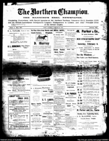 - ↑ The Northern Champion. 1 (1): 1. 2 February 1912 http://nla.gov.au/nla.news-page11722129. Retrieved 26 June 2013. Missing or empty
