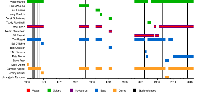 The band's original lineup—vocalist/organist Mark Stein, bassist/vocalist Tim Bogert, lead guitarist/vocalist Vince Martell, and drummer/vocalist Carmine Appice—recorded five albums during the years 1967–69, before disbanding in 1970. The band is currently touring with three of the four original members, Mark Stein, Vince Martell, and Carmine Appice with Pete Bremy on bass as Bogert retired in 2009.