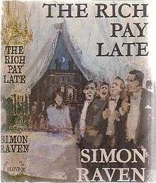 The Rich Pay Late is Volume I of the novel sequence Alms for Oblivion by Simon Raven, published in 1964. Although it was the first novel to be published in the sequence, it is the fourth novel chronologically, as the story takes place in and around London in 1956 and culminates with the Suez crisis and how it affects some of the characters.