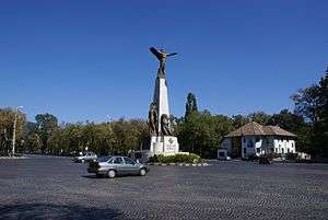 The Monument to the Heroes of the Air (Romanian: Monumentul Eroilor Aerului), located in the Aviators' Square, on Aviators’ Boulevard, Bucharest, Romania, was built between 1930 and 1935 by the architect and sculptor Lidia Kotzebuie (1885–1944), and by Iosif Fekete.[1] The structure, 20 m (65.6 ft) high, is made up of bronze sculptures resting on an obelisk-shaped stone pedestal, which in turn stands atop four trapezoidal prisms linked to each other by arcs. Beneath this entire complex is a circular stone base.