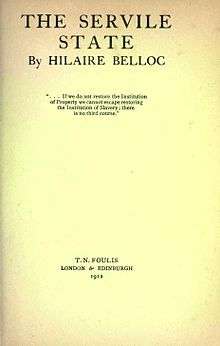 The Servile State is a book written by Hilaire Belloc in 1912 about economics. Although it mentions distributism, for which he and his friend G. K. Chesterton are famous,[1] it avoids explicit advocacy of that economic system.