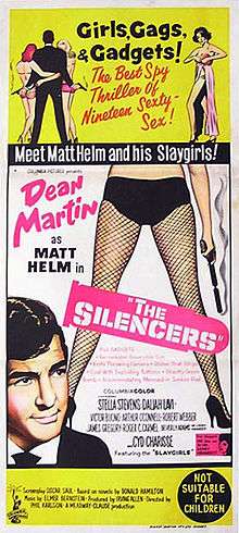 The Silencers is an American spy film spoof motion picture released in 1966 and starring Dean Martin as agent Matt Helm. It is loosely based upon the novel The Silencers by Donald Hamilton, as well as another of Hamilton's Helm novels, Death of a Citizen.
