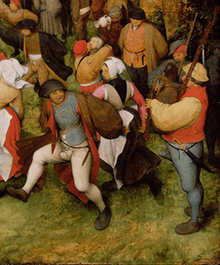 The movements of the people show that their behaviour is inappropriate or a caricature of rustic buffoonery, but its representation of fertility and reproduction is presented in a joyful manner.[17][22] Indeed, the painting reflects a degree of ambiguity in that it can both be seen as an attack on the stereotypical oversexed behaviour of the lower orders as well as evoking a comical picture.[23] In the sixteenth century, when this was painted, dance was subject to a strict code and regarded by the authorities and church as a social evil.[23] People could not swing their arms or legs or laugh too loud, as that would be considered a type of rudeness to many people.[23] The painting therefore "expresses the peasants' liberation from the stricter limits of upper classes" by failing to adhere to the expected social standards of the times.[23][24][25]