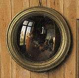 The panel shows von Werl kneeling in prayer as he is presented by John the Baptist in a domed interior. Campin was heavily influenced by van Eyck by the early 1430s, and this wing is indebted to him in a number of ways; in the fall of light, sharp detail and especially the convex mirror in the middle ground which reflects the scene back at the viewer, a direct reference to van Eyck's 1434 Arnolfini Marriage.[9] The form of the lettering on this wing identifies both the donor and date, and is heavily influenced by van Eyck's elegant, almost decorative, inscriptions.