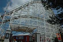 When the roller coaster first opened in 1917, it was a double out and back side friction coaster called "The Giant Coaster" at Paragon Park in Nantasket Beach, Massachusetts, just under 25 miles (40 km) south of Boston. Then, in 1932, Herbert Paul Schmeck redesigned much of the ride after it was partially destroyed by fire. In April 1963, another fire destroyed the station, trains, double helix finale and part of the lift hill. The park wanted John C. Allen to rebuild the coaster as it was, but his estimate proved too high for the traditional park. Instead he left out two bunny hops and the helix finale in order to create an angled approach into the brake run. Although nowhere near as exciting as Miller's finish, Allen gave the park an affordable option to tearing down the coaster. On July 19, 1963, Forest Park Highlands burned but the Comet was still standing. The Comet was torn down in 1968. Paragon Park bought the used trains from Forest Park Highland's Comet because they were much cheaper than buying new ones from Philadelphia Toboggan Company. For the remaining years the park was open, the Giant Coaster's trains ran with the name "Comet" emblazoned across the front of the car. "The Giant Coaster" suddenly closed with Paragon Park in 1984 and was sold to Wild World (now Six Flags America.) It acquired the ride in a last minute bid at auction. In 1986, Wild One opened in its current location, restored to its original condition, reincorporating the original helix at the end of the ride. Some of this retracking was completed by Martin & Vleminckx.[1] Wild One did not open for the 1991 season since the park was having financial difficulties. It reopened for the 1992 season and has been operational ever since.