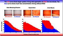 - Delivering chemotherapy to brain cancer cells and various drugs to other tissues is called acoustic targeted drug delivery (ATDD).[7] These procedures generally use high frequency ultrasound (1–10 MHz) and a range of intensities (0–20 W/cm2). The acoustic energy is focused on the tissue of interest to agitate its matrix and make it more permeable for therapeutic drugs.[8][9]