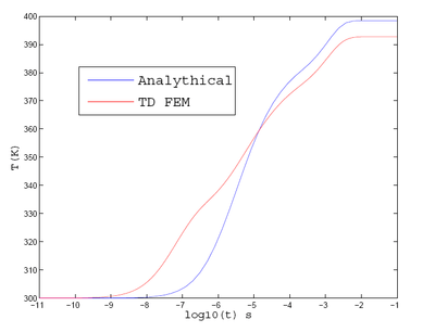The next figure shows a comparison of the peak temperature as a function of time for both methods. The system reaches steady state in approximately .