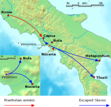 These escaped slaves were able to defeat a small force of troops sent after them from Capua, and equip themselves with captured military equipment as well as their gladiatorial weapons.[13] Sources are somewhat contradictory on the order of events immediately following the escape, but they generally agree that this band of escaped gladiators plundered the region surrounding Capua, recruited many other slaves into their ranks, and eventually retired to a more defensible position on Mount Vesuvius.[14]