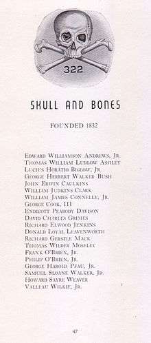 - ↑ Robbins, Alexandra (2002). Secrets of the Tomb: Skull and Bones, the Ivy League, and the Hidden Paths of Power. Boston: Little, Brown. ISBN 0-316-72091-7.
