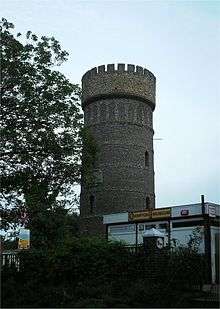 By 1851, Crampton was working for the South Eastern Railway (SER). In that year, ten new Crampton locomotives were built, and one of these, No.136 Folkstone was exhibited at The Great Exhibition.[7] In 1854, Crampton became a member of the Institution of Civil Engineers and in 1855 he was responsible for the building of the Berlin waterworks.[8] In 1856, Crampton was appointed to the Prussian Order of the Red Eagle.[5] In 1859, Crampton formed the Broadstairs Water Company, building a water tower 80 feet (24.38 m) high which now forms the Crampton Tower Museum. The water tower could hold 83,000 imperial gallons (380,000 l) of water. Broadstairs Water Company was taken over by Broadstairs Urban District Council in 1901. In 1860, Crampton designed a tower for Holy Trinity church, Broadstairs, which Dickens had described as a "hideous temple of flint, a petrified haystack". Crampton donated a clock as a personal gift to the church. he also donated a wrought iron bridge which was built across Goodson Steps. This is the Louisa Gap bridge, named after his youngest daughter.[1] Crampton was elected Vice-President of the Institution of Mechanical Engineers in 1883.[5]