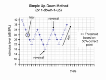 The simple ‘1-down-1-up’ method consists of series of descending and ascending trials runs and turning points (reversals). The stimulus level is increased if the subject does not respond and decreased when a response occurs.