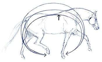 Throughness is often compared to a circuit of energy between horse and rider: the rider's leg aids encourage energetic movement in the hindquarters, which push the back upward, which in turn allows for connection with the front end and the bit, and the connection felt in the bit transmits a feeling of energetic movement back to the rider's hands.[1] Of course, this is a question of "feel", meaning a very soft reaction in the rider's hands. If a rider gives driving aids and the horse responds by putting a lot of weight into the rider's hands, the horse is not "through" at all, but unbalanced and dependent on the hands of the rider to keep itself in balance.