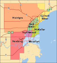 The city of Thunder Bay is divided into seven electoral wards: Current River, McIntyre, McKellar, Neebing, Northwood, Red River, and Westfort.[2] Residents of each ward elect one member to represent their ward on city council. Twenty-five people ran for these positions. All six incumbent ward councillors were re-elected. The incumbent councillor for McKellar did not seek re-election.