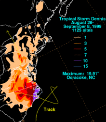 - 1 2 3 4 5 6 7 8 9 10 11 Beven, Jack (January 11, 2000). "Hurricane Dennis Tropical Cyclone Report". National Hurricane Center. Retrieved April 30, 2010.