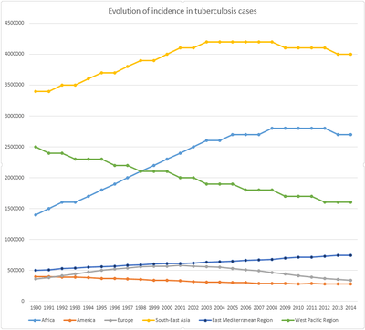 Evolution of incidence of tuberculosis cases per WHO region for the period 1990-2014.[10]