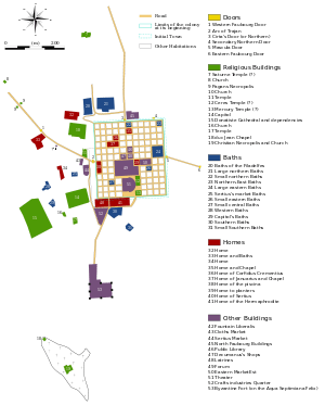 Located at the intersection of six roads, the city was walled but not fortified. Originally designed for a population of around 15,000, the city quickly outgrew its original specifications and spilled beyond the orthogonal grid in a more loosely organized fashion.