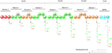 In the first study that looked at the gene cluster for tirandamycin production, Carlson et al. used primers specific for ketosynthase (KS) domains and CYP450 enzymes to probe the DNA of Streptomyces sp. 307-9, a previously determined producer of various tirandamycin analogues.[6] They found that the tirandamycin gene cluster is a PKS-NRPS hybrid that codes for three proteins with two, two and four PKS modules, and one other protein containing an NRPS module. Also, that the modules 0, 2, 6 and 7 AT domains are specific for loading or extending with malonate, while modules 1, 3, 4 and 5 are specific for methyl-malonate. The A domain in the NRPS module is specific for the amino acid glycine (See Figure 2). The cyclizations to form the tetramic acids’ 2,4-pyrrolidinedione ring and the bicyclic ketal system, as well as the oxidative transformations in the bicyclic skeleton, were suggested but further experimental evidence was needed.