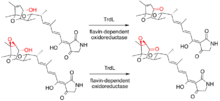 In another study Mo et al. characterized the biosynthetic gene cluster of the tirandamycins in Streptomyces sp. SCSIO1666 and described the function of one of the encoded proteins as a flavin-dependent oxidoreductase.[7] This enzyme was shown to be responsible for an oxidative transformation step (namely the 10-hydroxy dehydrogenation) to an intermediate that eventually leads to the ultimate product of the pathway, suggested to be tirandamycin B. Through a study of the metabolites produced after gene inactivation of the flavin-dependent enzyme and an in vitro characterization of the activity of the enzyme, they were able to conclude that the enzyme oxidizes tirandamycin E or F to tirandamycin A or D (See Figure 3).