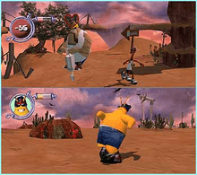 The game has been called both a platform game[6] and an action-adventure game.[9] GameSpot asserts that it combines elements of ToeJam & Earl and its platformer sequel, ToeJam & Earl in Panic on Funkotron,[9] while GameNOW and Electronic Gaming Monthly liken it to the former game.[10][11] The game features both single- and two-player modes; in both, players control one of the three protagonists. ToeJam moves quickly and jumps high, but has weak attacks; Earl is tougher and has more powerful attacks, but is slow and jumps lower than ToeJam; Latisha ranks between the two in terms of athleticism, and gains additional power-ups later in the game.[7] In the game's two-player mode, the camera moves between single and split-screen as players maneuver their characters away from each other. Characters can share power-ups when in close proximity.[7]