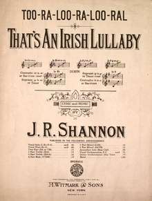 "Too-Ra-Loo-Ra-Loo-Ral (That's an Irish Lullaby)" was written by lyricist and actor Shannon in 1913 for the play Shameen Dhu ("Black-Haired Jimmy" or "Dark Jimmy").[1][2][3][4][5] Prior to the play's debut, singer Chauncey Olcott took it into the studio to record it on July 30, 1913.[6] Popular, his single peaked at #1 on the music charts in December 1913.[6][7][8]