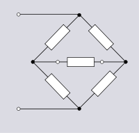 It is normal to call a network bridge topology only if it is being used as a two-port network with the input and output ports each consisting of a pair of diagonally opposite nodes. The box topology in figure 1.7 can be seen to be identical to bridge topology but in the case of the filter the input and output ports are each a pair of adjacent nodes. Sometimes the loading (or null indication) component on the output port of the bridge will be included in the bridge topology as shown in figure 1.9.[7]