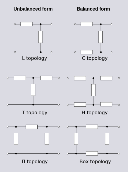 All these topologies can be viewed as a short section of a ladder topology. Longer sections would normally be described as ladder topology. These kinds of circuits are commonly analysed and characterised in terms of a two-port network.[6]