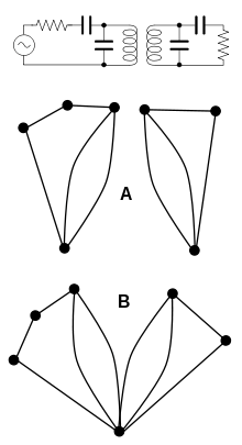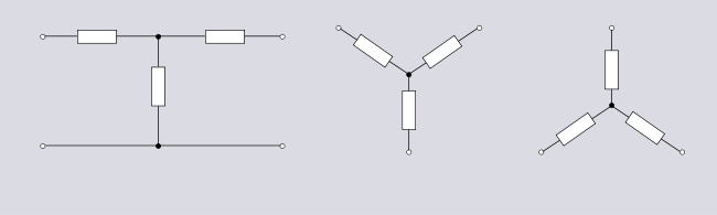 Many topology names relate to their appearance when drawn diagramatically. Most circuits can be drawn in a variety of ways and consequently have a variety of names. For instance, the three circuits shown in figure 1.1 all look different but have identical topologies.[2]