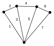 Conversely, topology is concerned only with the geometric relationship between the elements of a network, not with the kind of elements themselves. The heart of a topological representation of a network is the graph of the network. Elements are represented as the edges of the graph. An edge is drawn as a line, terminating on dots or small circles from which other edges (elements) may emanate. In circuit analysis, the edges of the graph are called branches. The dots are called the vertices of the graph and represent the nodes of the network. Node and vertex are terms that can be used interchangeably when discussing graphs of networks. Figure 2.2 shows a graph representation of the circuit in figure 2.1.[21]