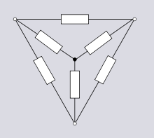 An example of this is the network of figure 1.6, consisting of a Y network connected in parallel with a Δ network. Say it is desired to calculate the impedance between two nodes of the network. In many networks this can be done by successive applications of the rules for combination of series or parallel impedances. This is not, however, possible in this case where the Y-Δ transform is needed in addition to the series and parallel rules.[4]