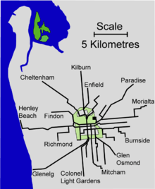 The network had termini in Henley Beach, Hindmarsh, Prospect, Nailsworth, Paradise, Magill, Burnside, Glen Osmond, Mitcham, Clarence Park, Hyde Park and Walkerville.[17] To accommodate the specific needs of horses, most streets were left unsealed. The horses' urine needed an unsealed surface for absorption and their hooves a soft surface for good traction.[10]