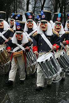 This visual rigidity is interrupted from time to time (in fact at the joins between the six main structural sections) by theatrical cadenzas, seemingly in reaction to the tension of the string players having to sit and play like zombies. First, a percussionist marches slowly onstage with a "Basel drum", like the ones still played in the Basel Fasnacht, and with a single loud stroke on the drum prompts the first violist to break into a berserk cadenza, quelled by the next shuttle-loom stroke. Then a stagehand brings out a music stand for the first cello, who plays an impassioned romantic solo, switched on and off by the light on the music stand. A little later, the concertmaster abruptly stands up and, as if in response to cramp, begins a nervous twitching on a single high note, bringing te entire orchestra to a stop. The string players all lean toward him and glare with reproach, and the rogue violinist, averting his gaze, meekly returns to his routine task (Cott 1973, 62–64). At the beginning of Part V, a solo trumpet appears in midair (actually by climbing a ladder behind the concealing wall) and plays a joyful reveille call, ending with a flatulent fluttertongued note, in the spirit of Richard Strauss's Till Eulenspiegel. The final interpolation, however, is an abrupt cessation of all sound for the better part of a minute, an intimidating "silent cadenza", marked at the centre by a triple shuttle stroke in a dotted-rhythm figure. The music then resumes to conclude the work with a dignified chorale-like coda, reminiscent of the ending of Stravinsky's Symphonies of Wind Instruments (Maconie 2005, 340–41).