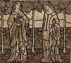 The 13 small[1] stained-glass panels depict scenes from the story of Sir Tristram and la Belle Isoude as told in Sir Thomas Malory's Morte d'Arthur.[2][3][4] They were commissioned by Walter Dunlop, a Bradford textile merchant, for a new music room to be built at Harden Grange, his house near Bingley, Yorkshire, and were designed and executed in 1862 by Morris, Marshall, Faulker & Co., the decorative arts firm established the year before by the Pre-Raphaelite artist William Morris in partnership with Dante Gabriel Rossetti, Edward Burne-Jones, Ford Madox Brown, Philip Webb, Charles Faulkner and Peter Paul Marshall.[2][3][4][5]