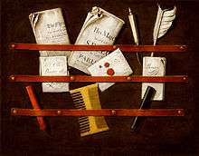 A fanciful form of architectural trompe-l'œil, quodlibet, features realistically rendered paintings of such items as paper knives, playing cards, ribbons, and scissors, apparently accidentally left lying around.[5]