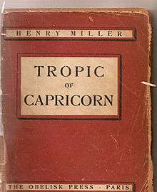 Tropic of Capricorn is a semi-autobiographical novel by Henry Miller, first published in Paris in 1938. The novel was banned in the United States until a 1961 Justice Department ruling declared that its contents were not obscene.[1] It was also banned in Turkey.[2] It is a prequel to Miller's 1934 work, the Tropic of Cancer.