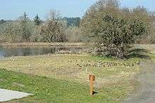 The refuge is home to almost 200 species of birds, more than 50 mammal species, and 25 species of reptiles and amphibians.[25] Tree species include red alder, aspen, maple, oak, Oregon white ash, Douglas fir, ponderosa pine, Pacific yew, and cedar.[6][7][12][28] A pair of 350-year-old oak trees can be found at the visitor center.[10] Plant species in the refuge include bulrushes, wapato, water plantain, as Oregon grape, wild trillium, camas, iris, snowberry, cattails, wild millet, wild rose, thimbleberry, and others.[7][9][10][12][28] Wildflowers include blue chicory, Douglas spirea, and purple crocuses.[29]