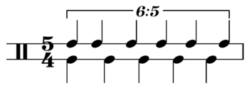 The n-tuplet notation shows the proportional increase or decrease of tempo needed for the bracketed notes, relative to the prevailing tempo. For example, a bracket labeled "5:4" (read five in the space of four) could group together durations (notes or rests) with a total of five sixteenth notes. A tempo 5/4 faster than usual then compresses these events into the space of four sixteenth notes.