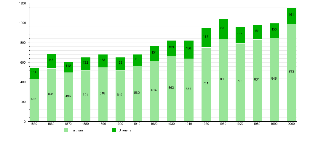 Turtmann-Unterems has a population (as of December 2015) of 1,117.[2] As of 2013, 10.1% of the population are resident foreign nationals. Over the last 3 years (2010-2013) the population has changed at a rate of -2.77%. The birth rate in the municipality, in 2013, was 14.2 while the death rate was 8.0 per thousand residents.[4]