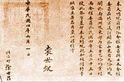 The Twenty-One Demands (Japanese: 対華21ヶ条要求, Taika Nijūikkajō Yōkyū, simplified Chinese: 二十一条; traditional Chinese: 二十一條; pinyin: Èrshíyī tiáo) were a set of demands made during the First World War by the Empire of Japan under Prime Minister Ōkuma Shigenobu sent to the government of the Republic of China on January 8, 1915.[1] The demands would greatly extend Japanese control of Manchuria and of the Chinese economy, and were opposed by Britain and the United States. In the final settlement Japan gained a little but lost a great deal of prestige and trust in Britain and the US.