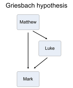 The two-gospel hypothesis is that the Gospel of Matthew was written before the Gospel of Luke, and that both were written earlier than the Gospel of Mark.[1] It is a proposed solution to the Synoptic Problem, which concerns the pattern of similarities and differences between the three Gospels of Matthew, Mark, and Luke. The hypothesis, following an original proposal by Augustine and expanded by Johann Jakob Griesbach (it was once called the Griesbach hypothesis), was introduced in its current form by William Farmer in 1964.[2] This hypothesis is the most serious alternative to the two-source hypothesis.[3] Its main advantages over the two-source hypothesis include the fact that it relies not just on internal evidence, that it does not require lost sources like the Q document, and that it is supported by the view of the early Church. Unlike the two-source hypothesis, the two-gospel hypothesis concludes that the traditional accounts of the gospels (order and date of publication, as well as authorship) are accurate.[4] A further development of the Augustinian and Griesbach hypotheses is found in the hypothesis of Eta Linnemann, followed by F. David Farnell, that the "two Gospels" were required by the "two witnesses" rule of Deuteronomy.[5]