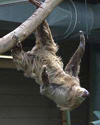 Two-toed sloths spend most of their lives hanging upside down from trees. They cannot walk, so they pull hand-over-hand to move around, which is at an extremely slow rate. Being predominantly nocturnal, their fur, which grows greenish algae to blend in, is their main source of protection.[13] Their body temperatures depend at least partially on the ambient temperature; they cannot shiver to keep warm, as other mammals do, because of their unusually low metabolic rates and reduced musculature.[12] Two-toed sloths also differ from three-toed sloths in their climbing behavior, preferring to descend head first.