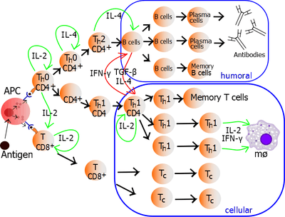 Th1/Th2 Model for helper T cells. An antigen is ingested and processed by an APC. It presents fragments from it to T cells. The upper, Th0, is a T helper cell. The fragment is presented to it by MHC2.[11] IFN-γ, interferon γ; TGF-β, transforming growth factor β; mø, macrophage; IL-2, interleukin 2; IL-4, interleukin 4