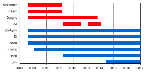 From left to right: Eli, Dongho, Hoon, AJ, Kiseop, Kevin, Soohyun | |