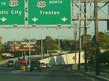 A multilane divided highway approaching an interchange with a sign over the road reading U.S. Route 130 north Trenton with two down arrows