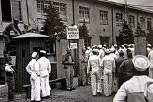 Japan accepted the terms of the Potsdam Declaration and surrendered on August 15, 1945. Over 5,000 Japanese Americans served in the occupation of Japan.[67] Dozens of Japanese Americans served as translators, interpreters, and investigators in the International Military Tribunal for the Far East. Thomas Sakamoto served as press escort during the occupation of Japan. He escorted American correspondents to Hiroshima, and the USS Missouri in Tokyo Bay. Sakamoto was one of three Japanese Americans to be on board the USS Missouri when the Japanese formally surrendered. Arthur S. Komori served as personal interpreter for Brig. Gen. Elliot R. Thorpe. Kay Kitagawa served as personal interpreter of Fleet Admiral William Halsey Jr..[68] Kan Tagami served as personal interpreter-aide for General Douglas MacArthur.[69] Journalist Don Caswell was accompanied by a Japanese American interpreter to Fuchū Prison, where the Japanese government imprisoned communists Tokuda Kyuichi, Yoshio Shiga, and Shiro Mitamura.[70]