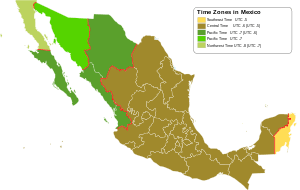 | UTC−07:00 | UTC−06:00 | Zona Pacífico | Mountain Time | |