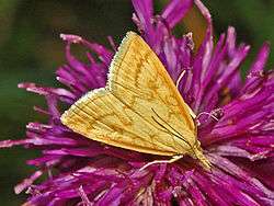 Udea lutealis has a wingspan of 23–26 mm.[1] Forewings are pale creamy or yellow ocher with darker undulating cross. The hind wings are light gray to whitish on the underside, while the body is whitish.[1] These moths fly at night from June to August depending on the location, in one generation.[1] The larvae are polyphagous, feeding on various herbaceous plants, mainly Rubus, Centaurea, Plantago, Cirsium and Artemisia.[1][2]