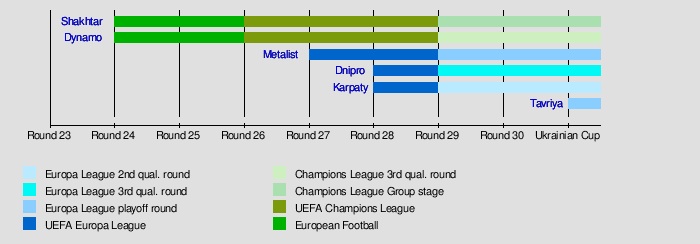 - Metalist Kharkiv's 4–1 away victory over Zorya Luhansk in the 29th Round secured them a third-place finish in the competition and a place in the Europa League play-off round. Also in the same round, Dnipro Dnipropetrovsk completed a 4–1 home victory against Illichivets which secured fourth-place and entry into Europa League third qualification round, since Karpaty Lviv lost 0–2 at home to Kryvbas Kryvyi Rih, leaving them in fifth place and qualification into the second qualification round.