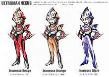 All of Nexus' forms (including The Next and Noa), were designed by Hiroshi Maruyama. His original design was meant to be neutral but was soon enhanced with Japanese clothing.[9] Nexus's head resembled the kabuto helmet and his entire body is based on hakama. The black lining on his body was themed after calligraphy. When he transforms into Junis, the suit would feature another resemblance to kamishimo.[10][11] Hiroshi Maruyama had also proposed three design variations for Junis Modes for Ultraman Nexus.[12]