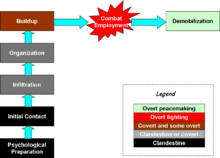 A SF UW campaign is now defined to have seven steps, ending in combat and demobilization. Changing concepts in UW, however, may change the model so that the UW force avoids entering the main combat phase, but carries out critical support operations with the steps before it.